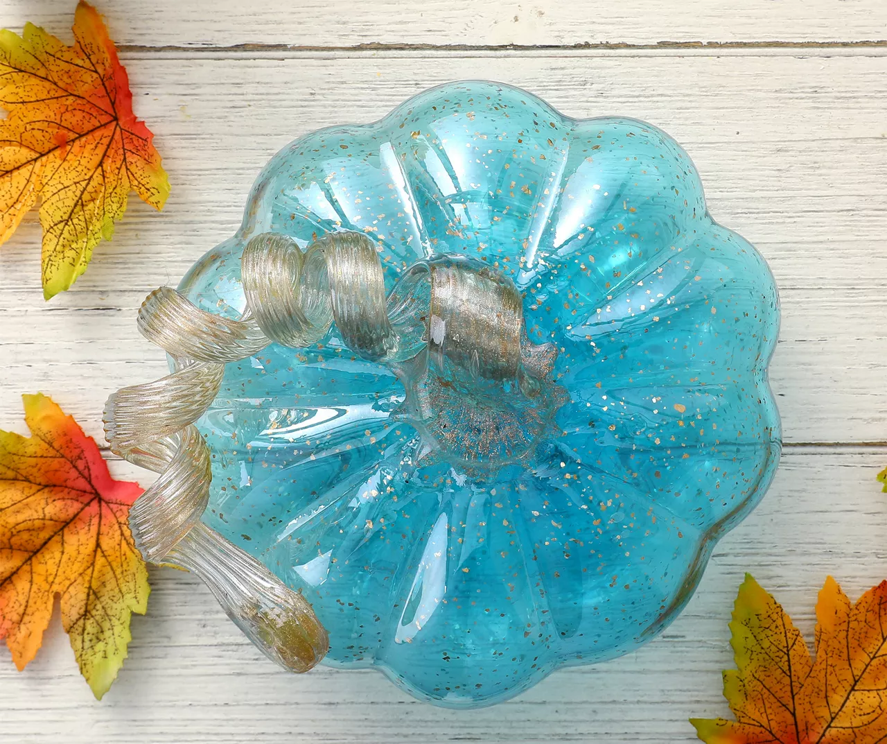 Adorn your home in stunning fall design using this glass pumpkin. Its hand-blow ribbed shape features a beautiful blue look with speckles of gold. Topped with a curly textured stem, it’s a marvelous addition to a mantel, table or shelf.