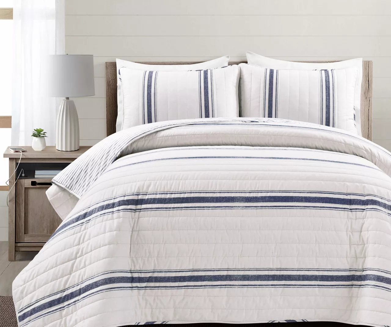 Distressed navy stripes on a soft beige background bring rustic farm flair to this cozy quilt set featuring neatly stitched rows for a traditional look that’s timeless. The breathable cotton construction is sure to keep you comfy and cozy through the night.