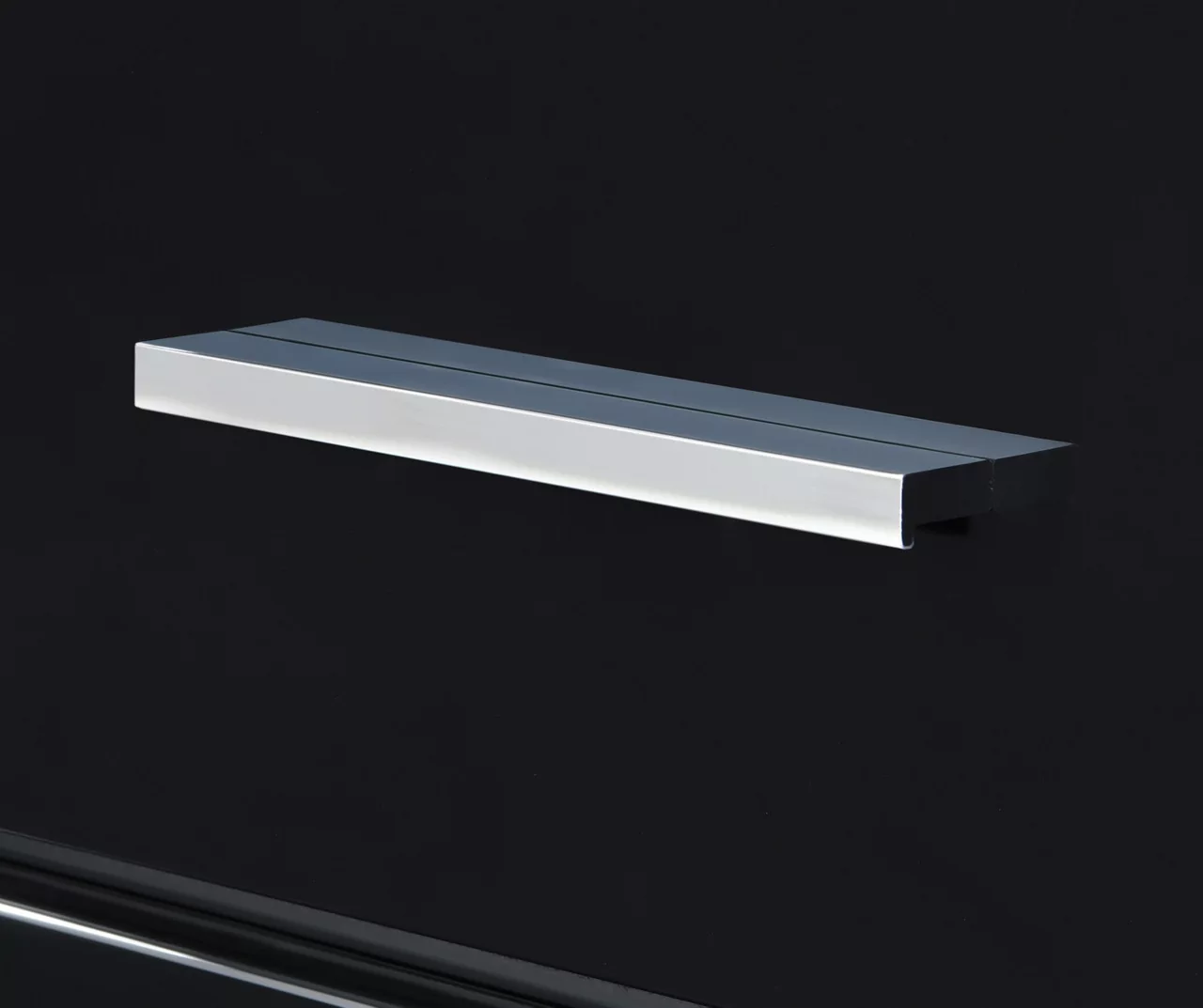 - Chromed drawer handles enhance the clean lines of this piece