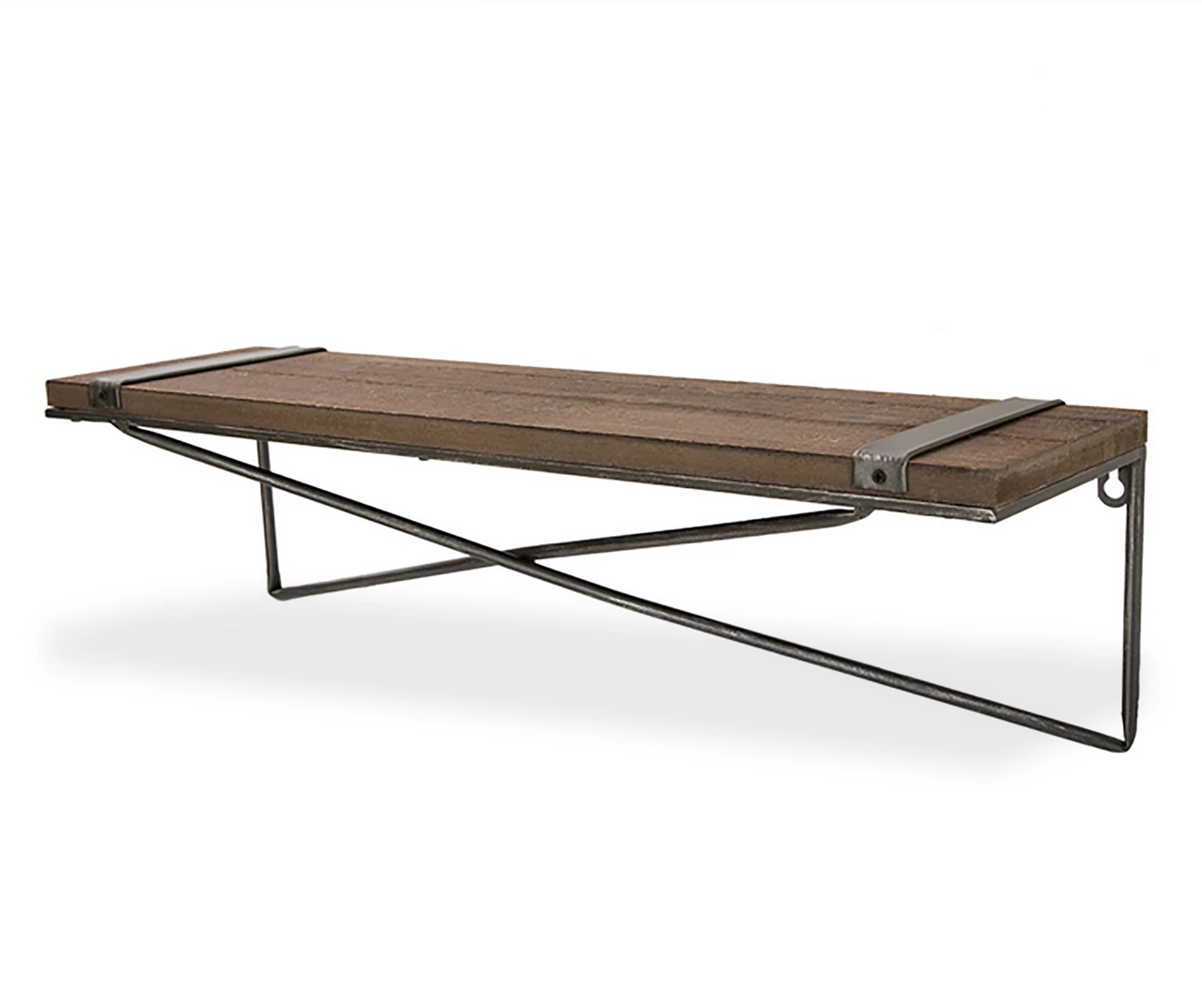 Crisscrossing bars underscore the dark wood platform of this wall shelf topped by black metal accents for industrial flair. Keyholes in the back make installation quick and easy, and a variety of sizes lets you customize your decorative arrangements to suit your needs.