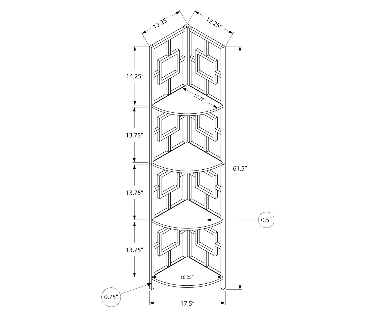Perfect for photo frames, plants, other decorative items and even kitchen accessories, this transitional-style corner bookcase will upgrade your décor. Including four dark taupe display shelves, this corner display unit features a three-leg black metal frame and a square design that will add modern flair wherever you choose to place it.