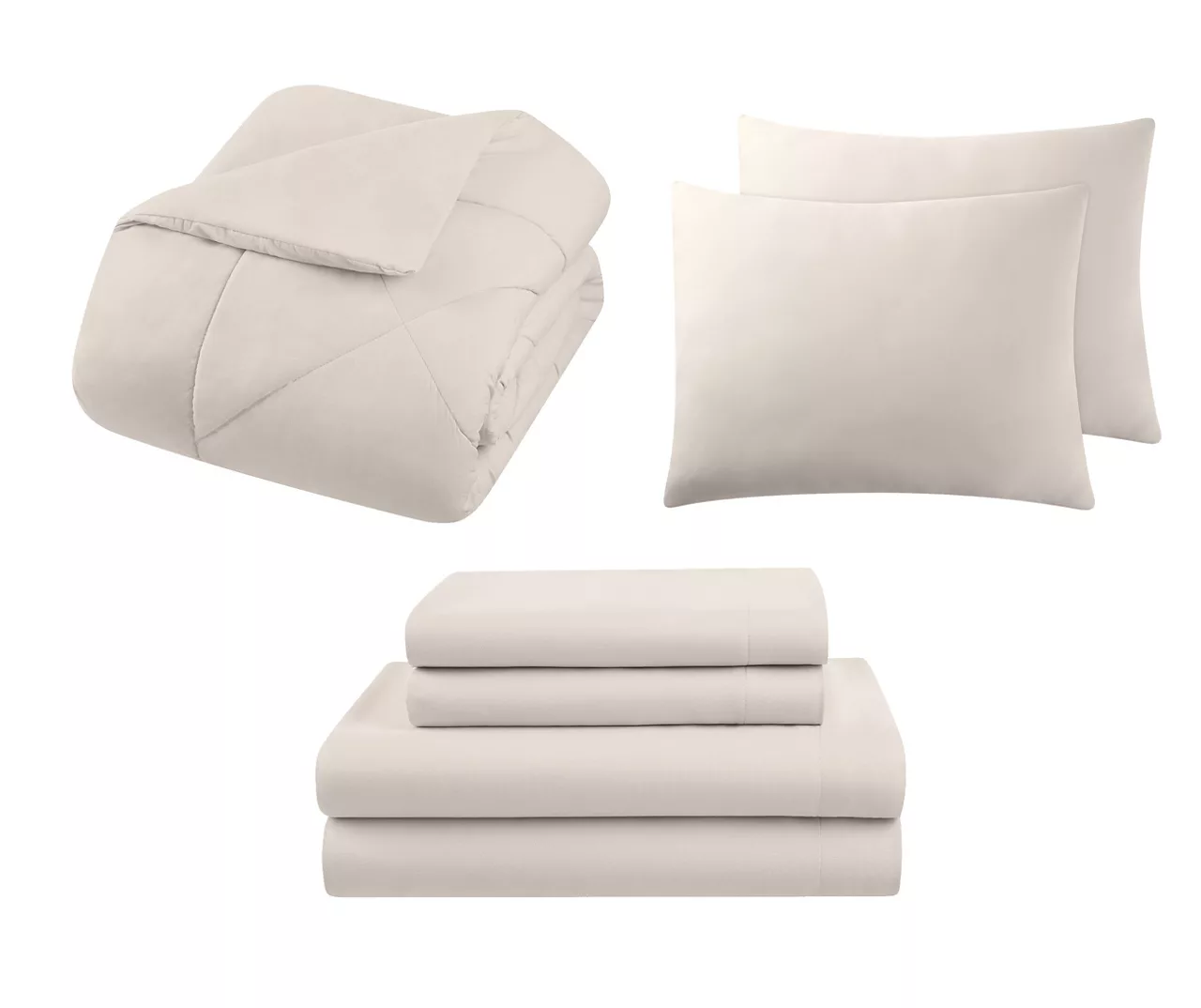 - Includes comforter, 2 shams, flat sheet, fitted sheet and 2 pillowcases