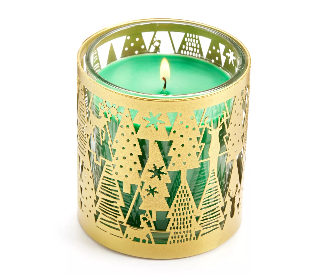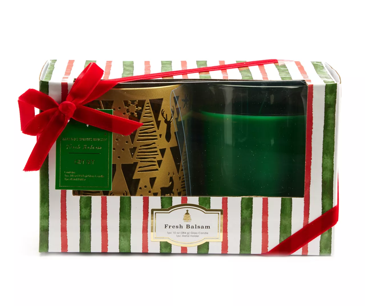 This candle and sleeve gift set brings the wonderful fragrances of winter into your home. Scented wax features a Fresh Balsam-inspired aroma with notes of cypress, cedarwood, apple and rosemary. Complete with a metal sleeve decorated with cut-out seasonal icons, this gift set is a charming present for a friend, co-worker or loved one.