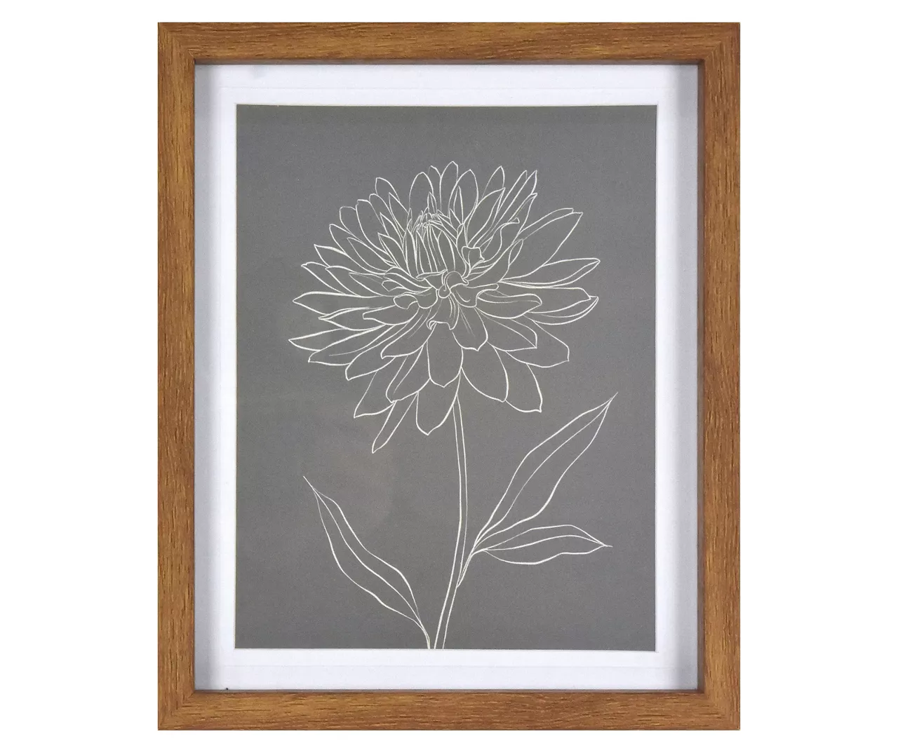 Create a curated look for your home displaying this framed décor. A sketch of a flower is featured in the center on a gray background. Crafted with an inner white border and brown wood frame, this piece is a beautiful addition to a living space, dining room or entryway.