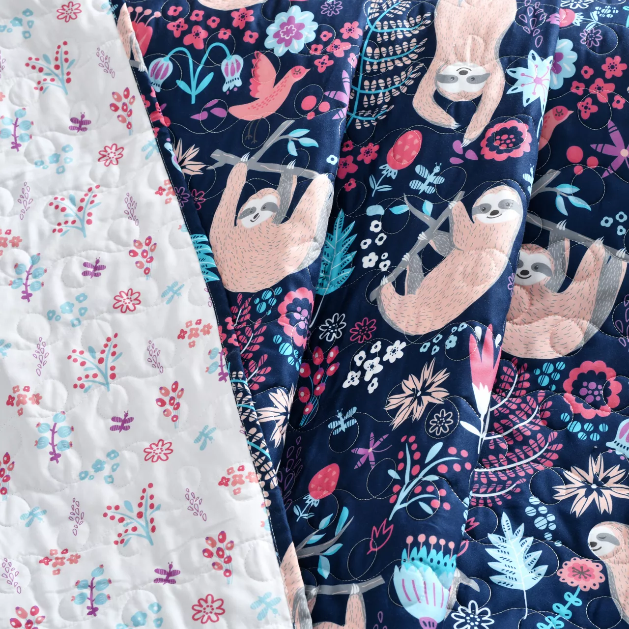 Charming blossoms and smiling sloths adorn this colorful throw for a home accent that brings cheerful vibes and vibrant personality to your living space. Quilted polyester fabric keeps you cozy on cool days and evenings.