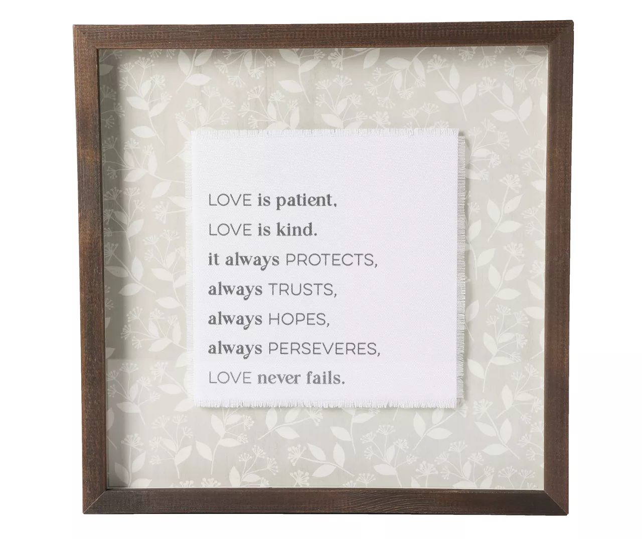 - “Love is patient, love is kind. It always protects, always trusts, always hopes, always perseveres, love never fails.” message in black font on a white background