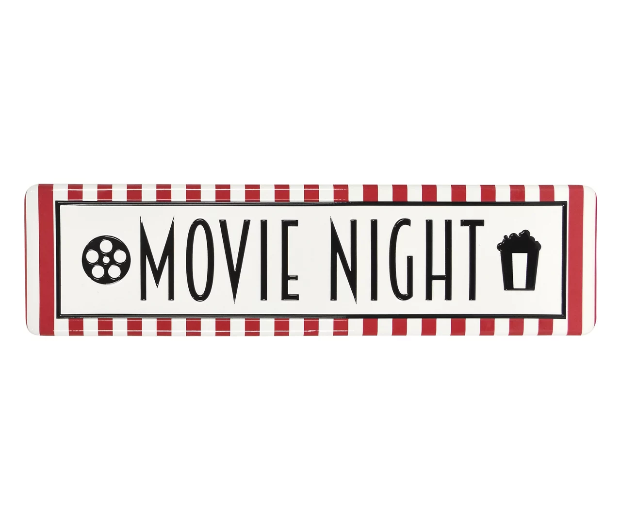 Complete your home theater or entertainment room with the charming film-themed design of this wall plaque featuring a modern look with classic red and white stripes and subtle film reel and popcorn bucket accents.