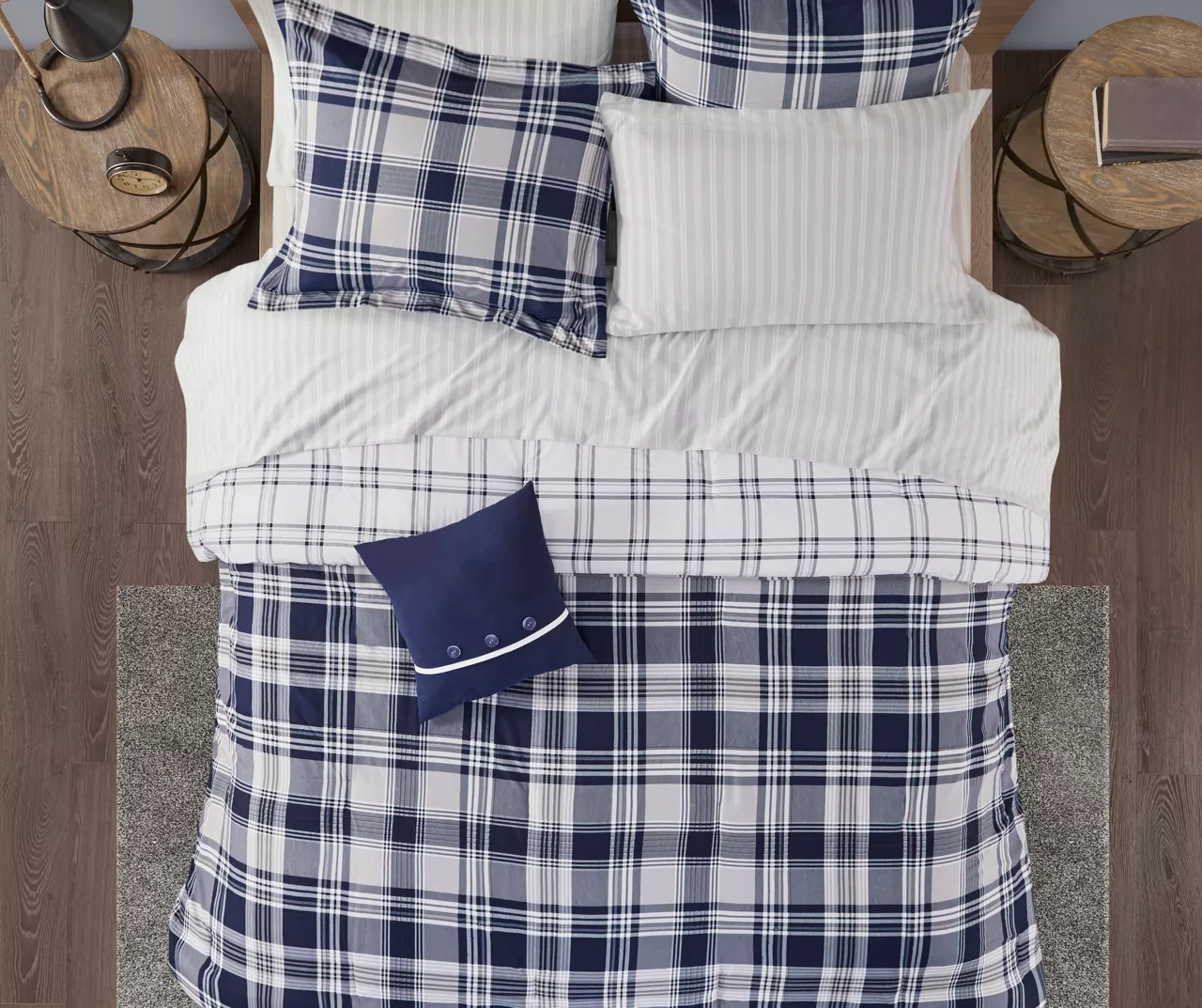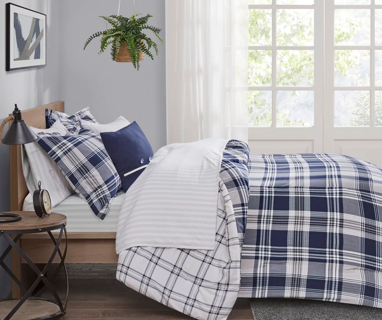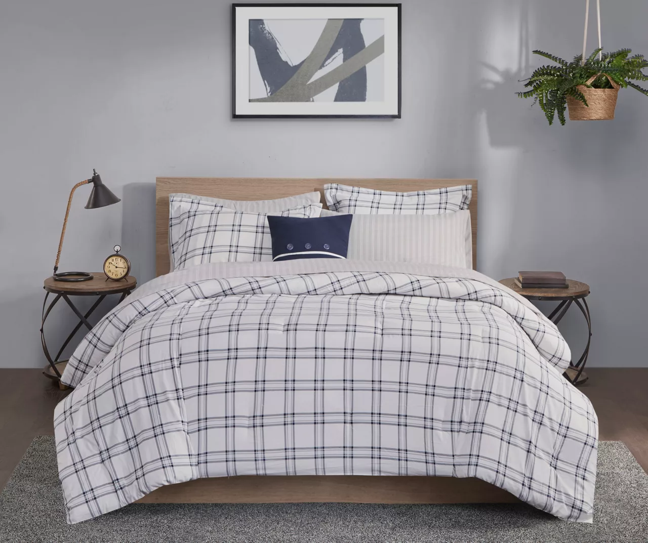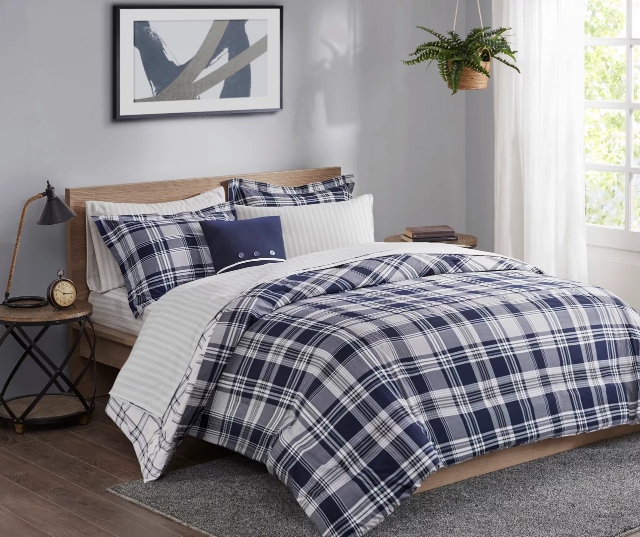 Restyle your bedroom with the Leroy Reversible Complete Bedding Set. The reversible comforter and shams feature a plaid print on the face and a white plaid print on the reverse, for a charming casual look. A coordinating square decorative pillow adds a finishing touch to the comforter. Also included is a sheet set, complete with a flat sheet, fitted sheet, and 2 pillowcases. Bringing the best in health and wellness, this bedding set also features an anti-microbial treatment that provides built-in freshness protection, reducing the growth of odor causing bacteria and keeps fabric lasting longer. This bedding set is also OEKO-TEX certified, meaning it does not contain any harmful substances or chemicals, ensuring quality comfort and wellness.