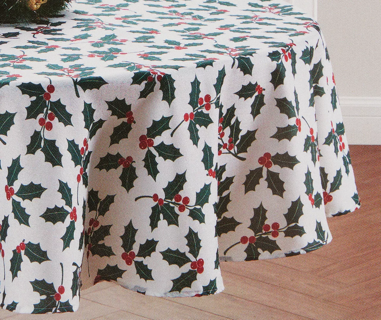 Freshen your dining space for the holidays with this elegant fabric tablecloth from the Santa’s Workshop collection. The fabric provides gentle protection for your surfaces while the bright holly pattern lends a festive canvas for you to create unique tablescapes.
