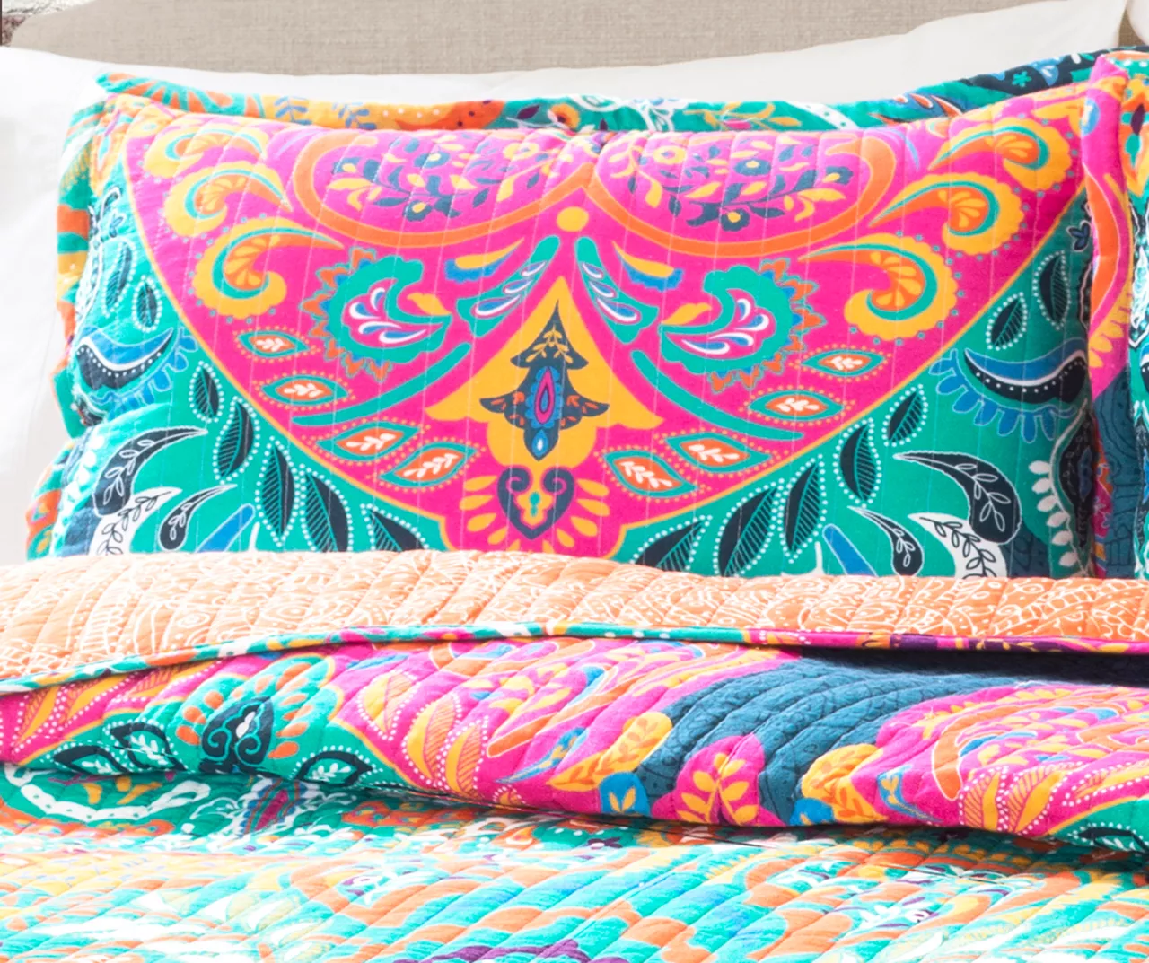 A winding, intricate pattern with paisley detailing in jewel-tone hues defines the front of this quilt set from Lush Décor for a vibrant, bohemian sleep space that’s oh-so chic. Matching shams complete the look, and the quilt reverses to an orange paisley pattern for bedroom style you can switch on a whim.