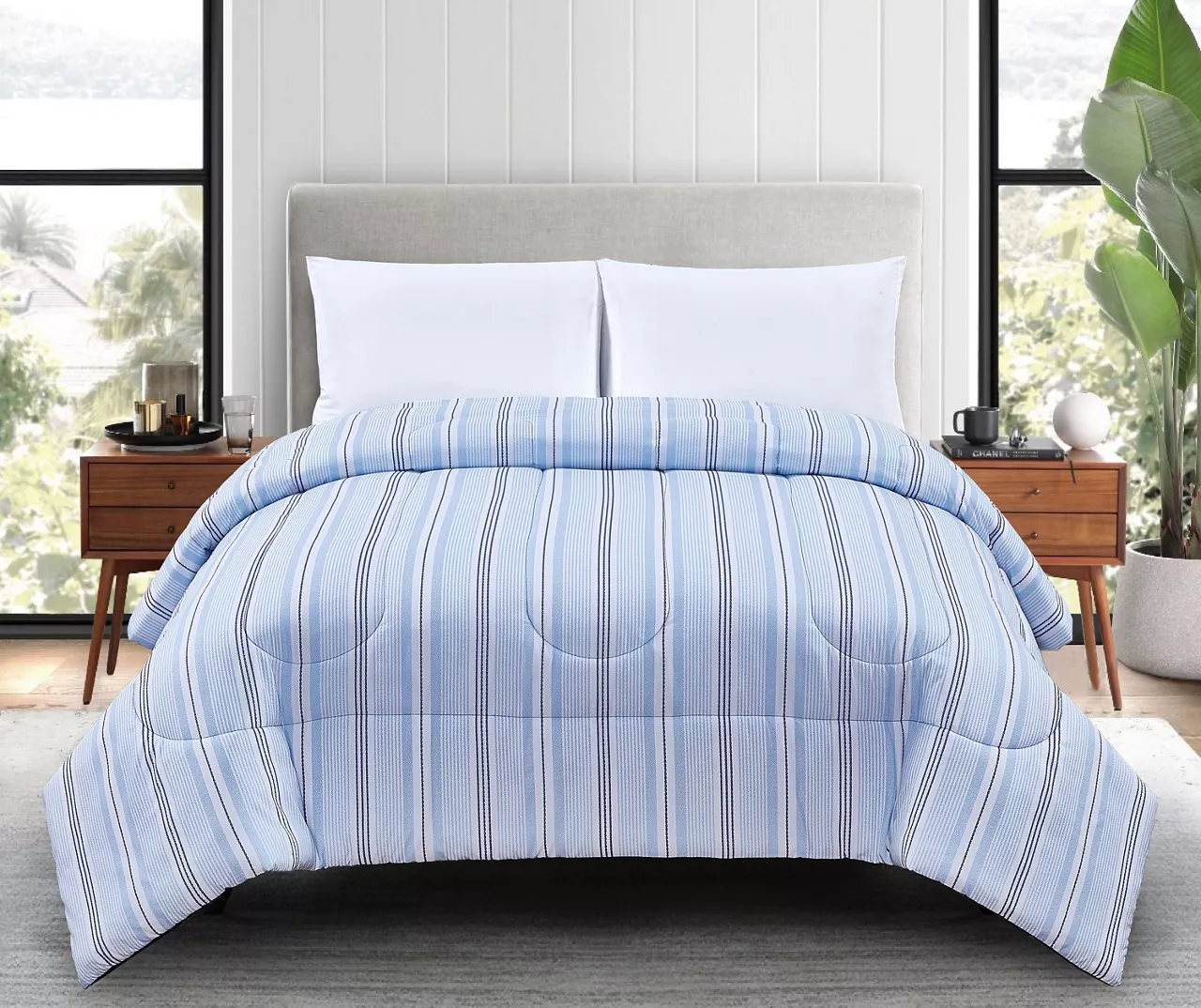 This cozy comforter from Bargain Bungalow is a chic update to your bedroom or guest room with a classic blue and white stripe print. It can be reversed to a solid navy side, allowing you to transform your room in a pinch. Perfectly filled for warmth and comfort in all seasons, this comforter is supersoft, machine-washable and wrinkle-resistant for easy care.